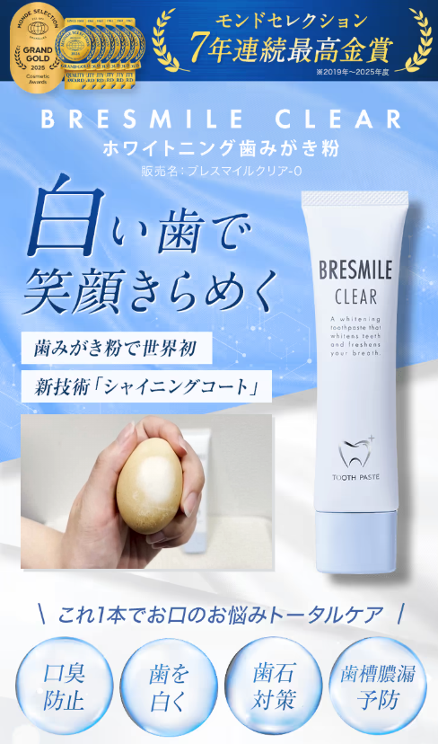ブレスマイルクリアは、ホワイトニングと口臭ケアを両立した薬用歯磨き粉。