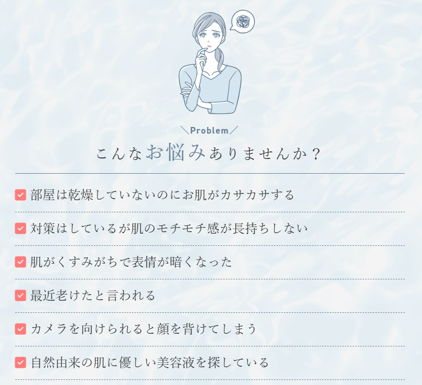 乾燥・ハリ不足・くすみなど、年齢とともに増える肌悩みにしっかり働きかけます。