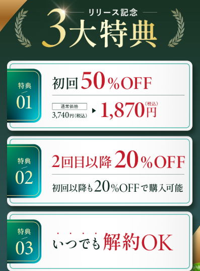さらに、初回は1,870円(税込)と続けやすい価格設定。定期コースも「いつでも解約OK」で、気軽に試したい方にも向いています。