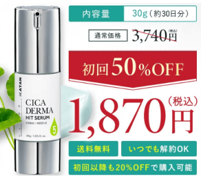 KATAN Cica ダーマヒットセラム5は、乾燥しやすい肌をうるおいで整えたい方、優しい使用感の美容液を求める方に理想的なアイテム。初回1,870円で気軽に始められ、解約の制約もないため、安心して試すことができます。