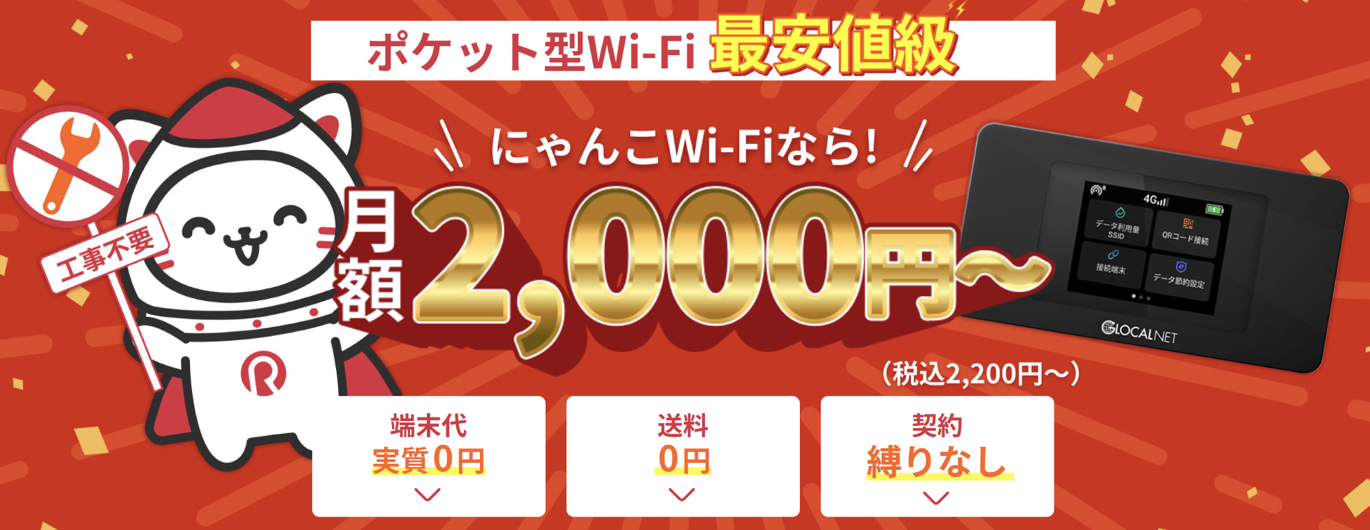 にゃんこWi-Fiは、契約期間の縛りがなく、業界最安級で利用できるポケットWi-Fiサービスです。使いたい時だけ使え、解約金も不要なため、初めてモバイルWi-Fiを検討する人にも安心して選べます。