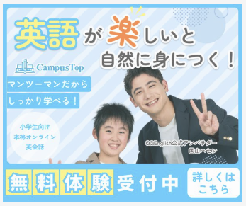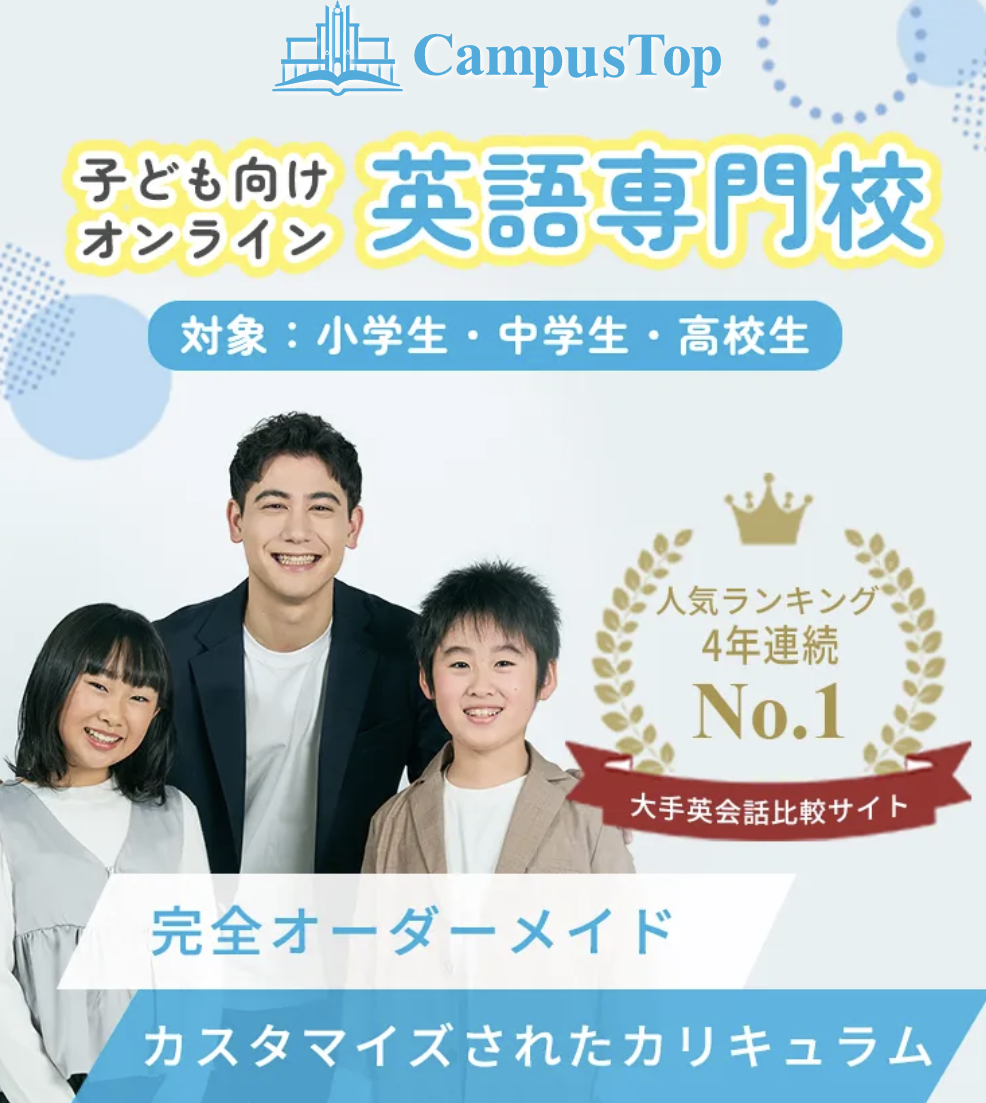 CampusTopは、小学生が「英語が好きになる」「英語で話せるようになる」ためのカリキュラムに特化したオンライン英語専門校。英語の基礎力から実践的な会話まで、子どもの成長段階に合わせて無理なく伸ばす指導が評価されています。