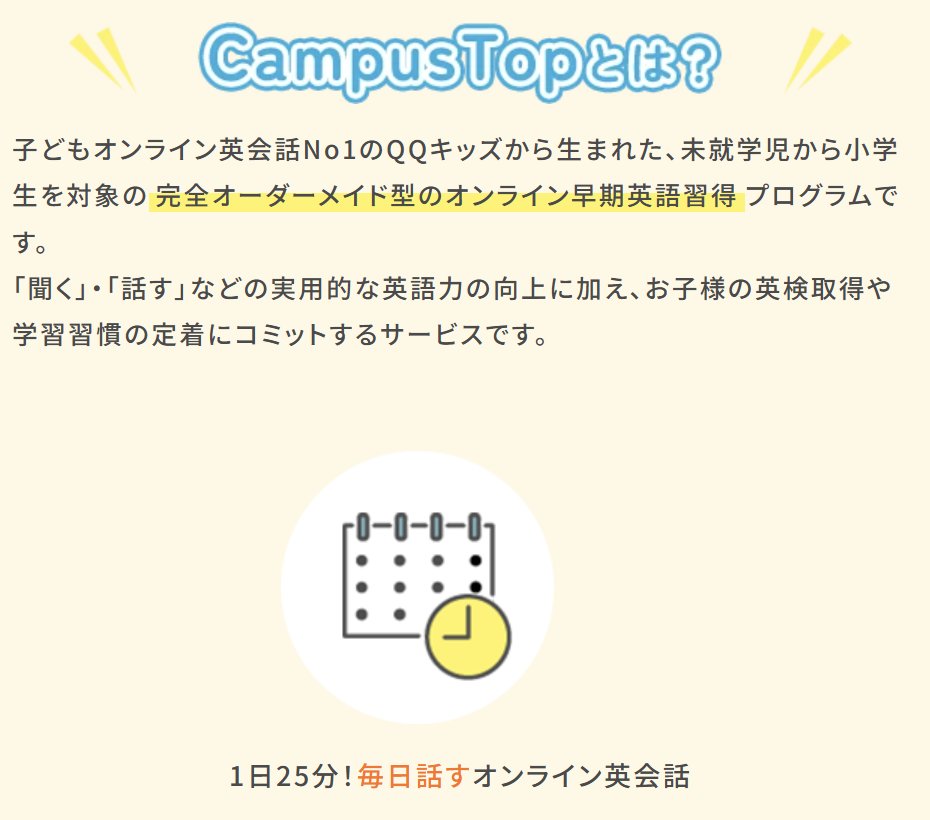 CampusTopは、小学生に特化した指導、楽しく続けられる環境、将来の英語力につながるカリキュラムを揃えた総合オンライン英語スクールです。