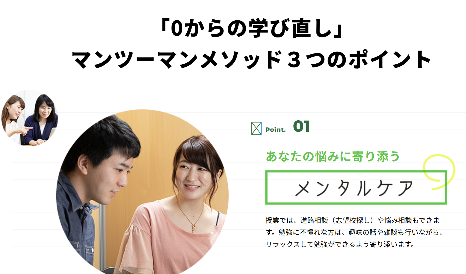 苦手の克服はもちろん、学習習慣づくり、自己肯定感アップにもつながる指導を行っている点が大きな魅力です。